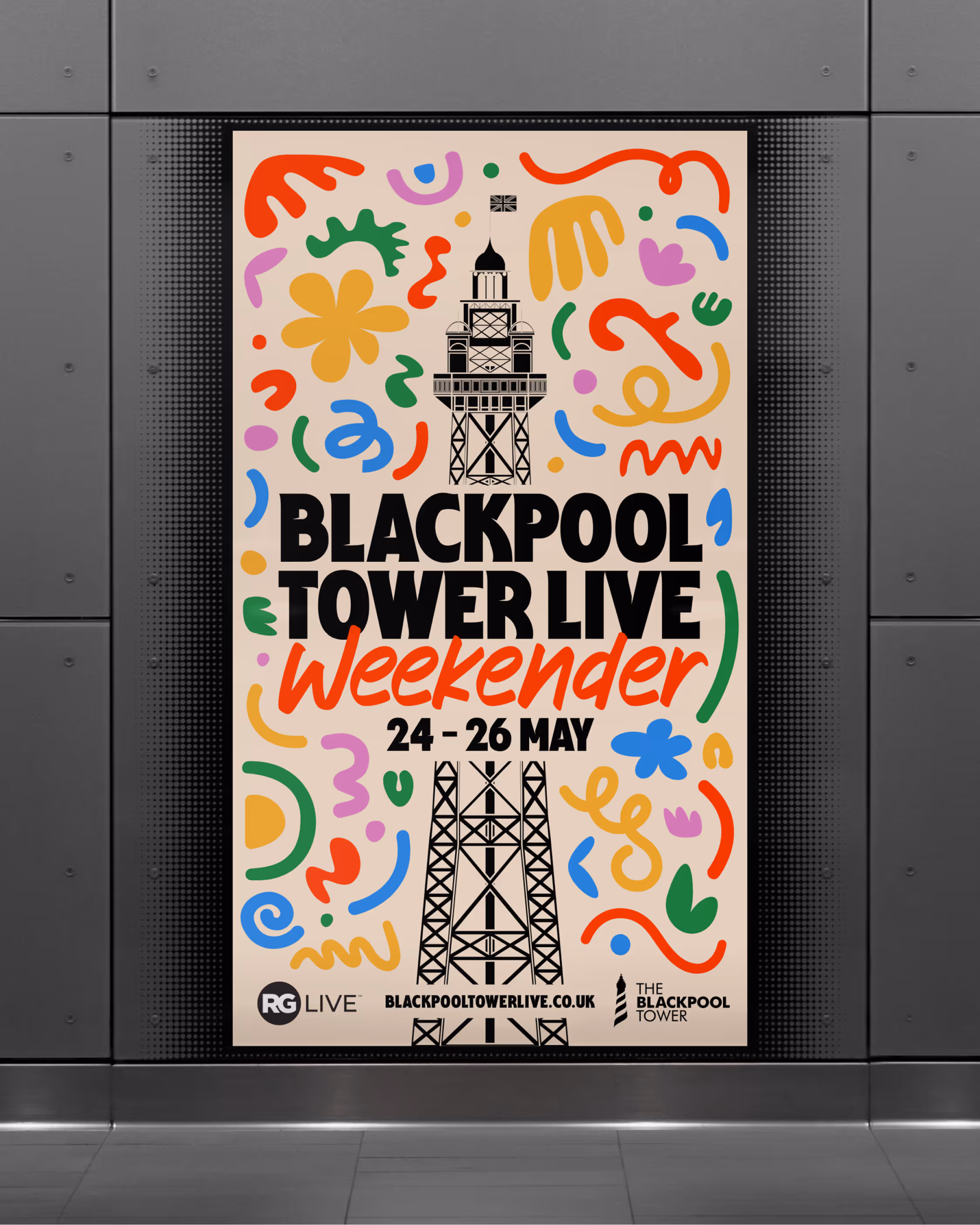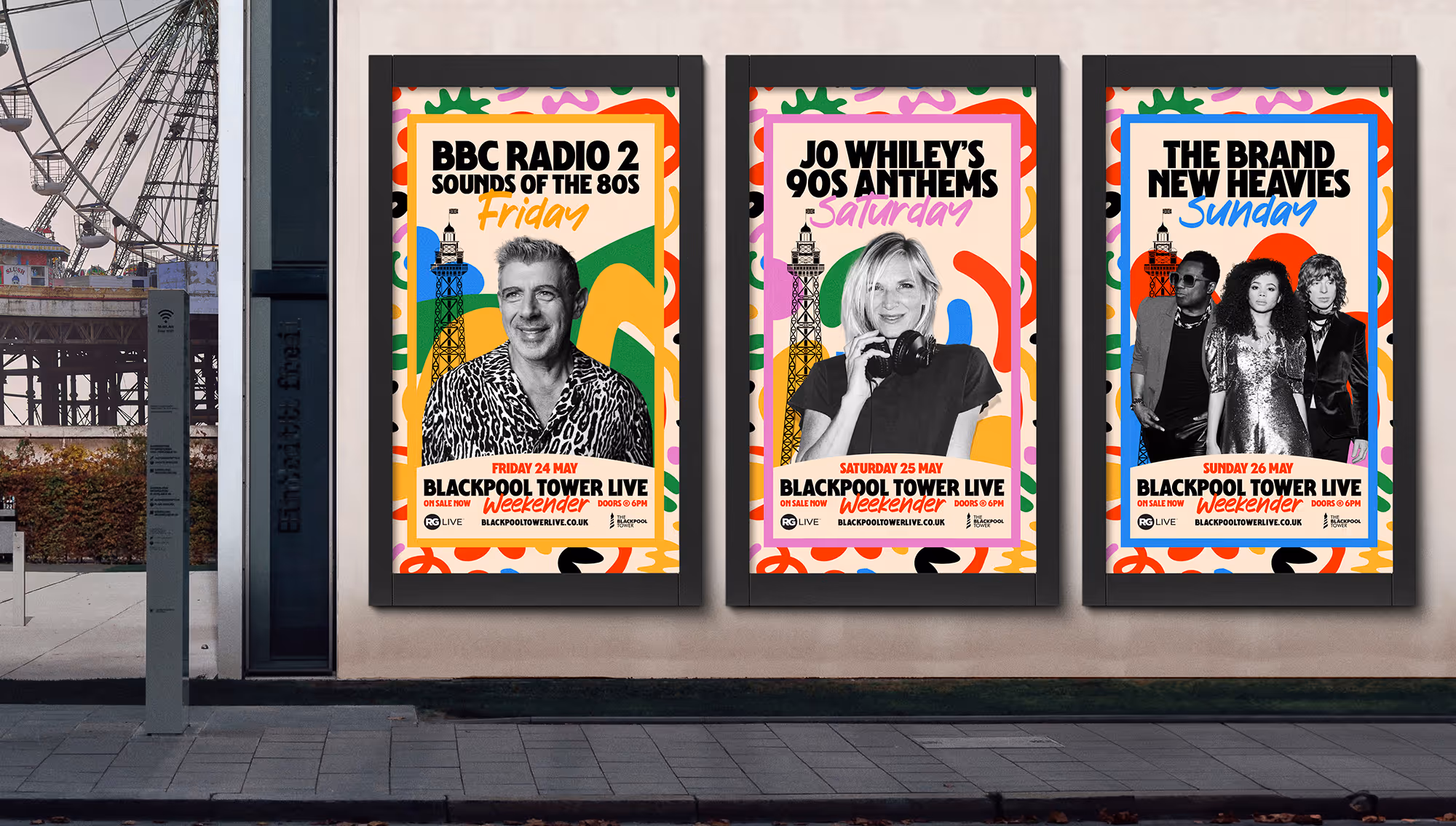 RG Live, a promoter arm of Sony Music which runs music-themed events, was hosting a new musical show: Blackpool Tower Live. This three-day festival featured BBC 2 Sounds of the 80s DJ Gary Davis, 90s anthems from DJ Jo Whiley, and performances by funk sensation Brand New Heavies. We were asked to create a brand for the event that felt inclusive of all the musical eras, as well as the local area.
