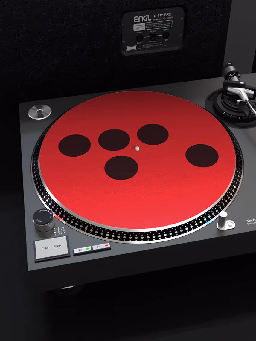 Stationery is die cut with our mark, reinforcing the creative direction of 'player piano' music punch cards. In static promotional materials, the audio array is shaped by the specific film the still originates from, creating a unique yet instantly recognisable visual device. For high-profile projects, special acetates are created as client gifts, featuring a still from the work on the cover, die-cut with the logomark to reveal the brand’s signature 'Redline Red' on the inner sleeve.